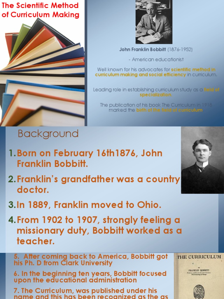 This book has beenrecognized by many scholars as the beginning of structured curriculum. Franklin Bobbitt and the Science of Curriculum Making. Thorndike and Judd had through their work established themselves as leaders in scientific education.